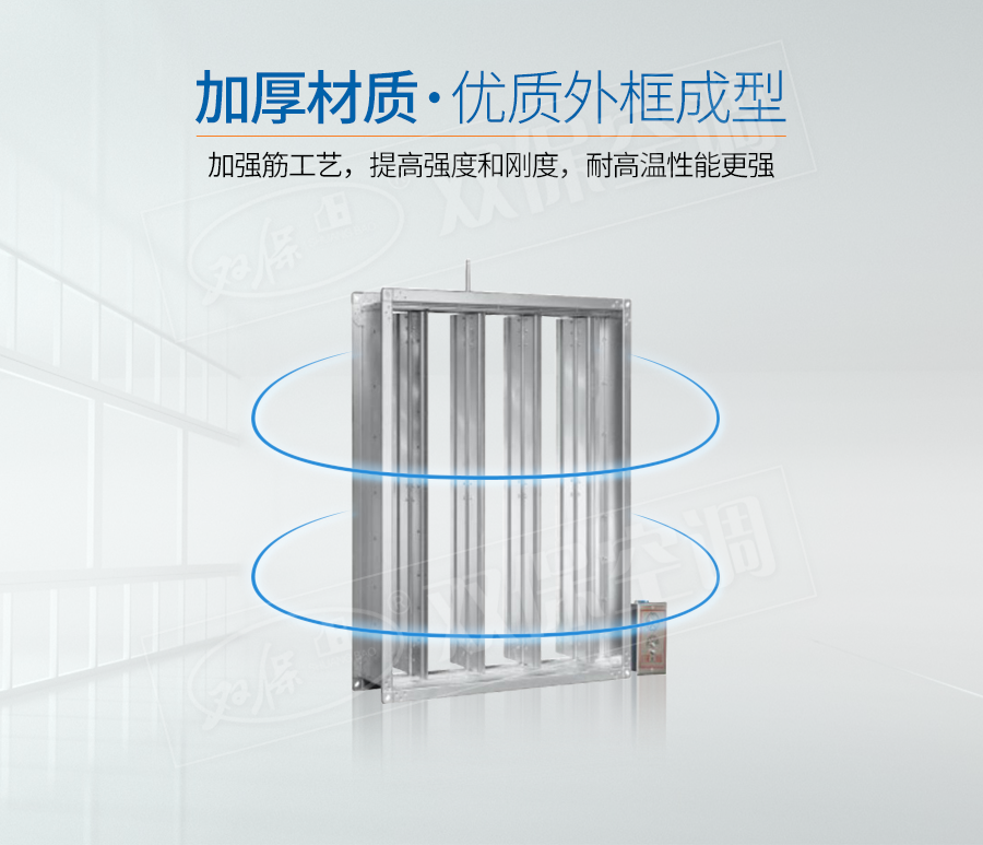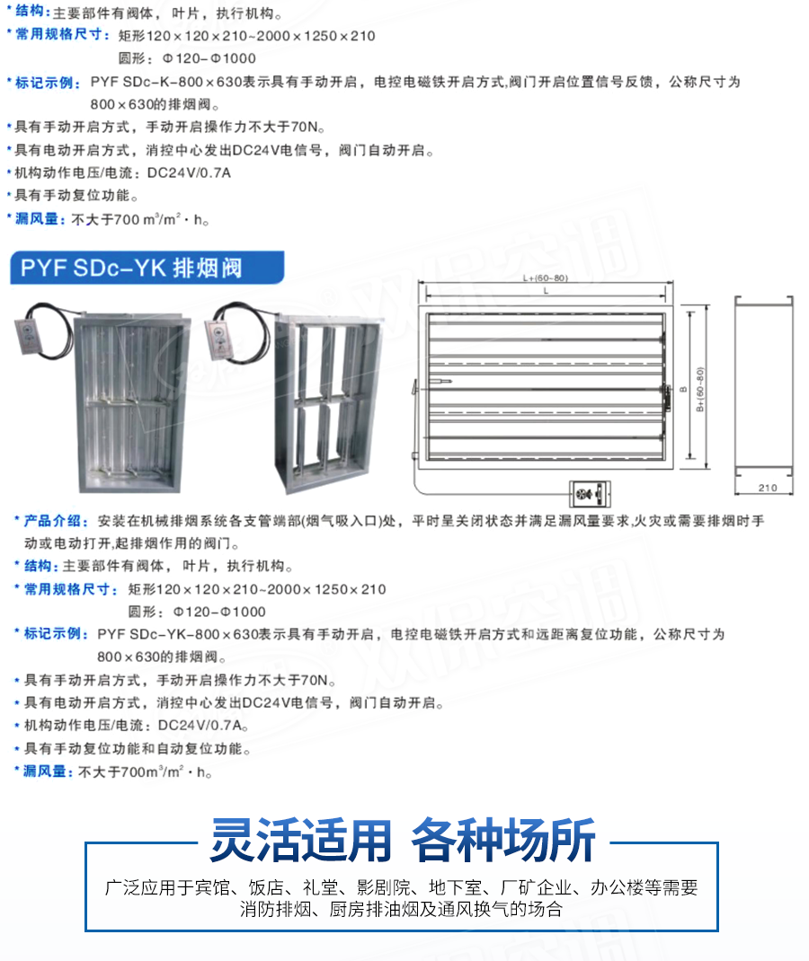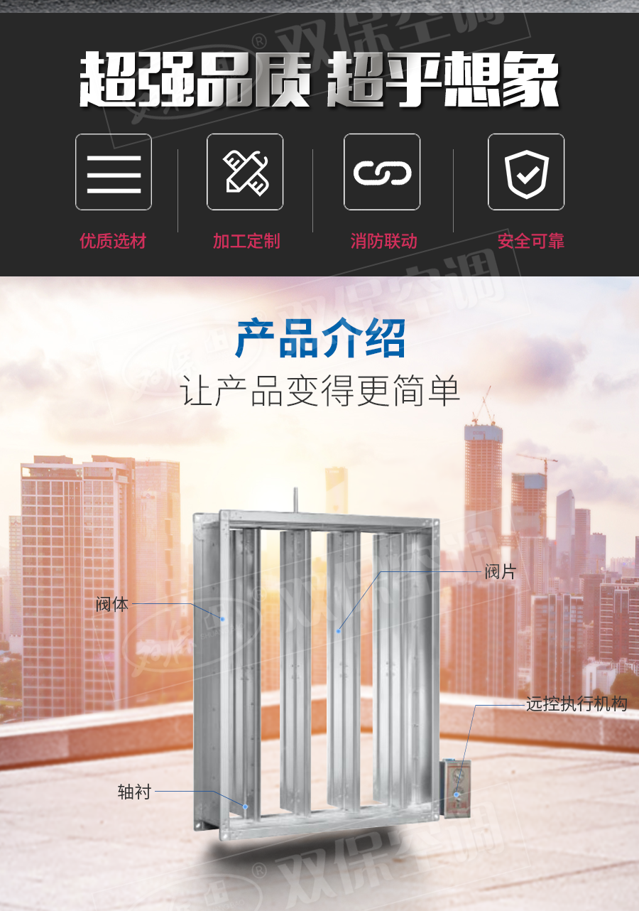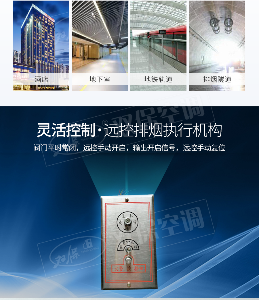 江蘇雙保空調有限公司—遠控排煙閥 閥門平時常閉; Dc24V電動開啟,遠控手動開啟,輸出開啟信號; 遠控手動復位。