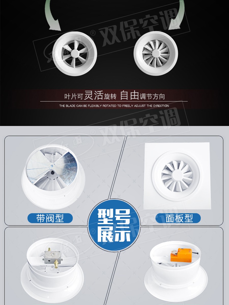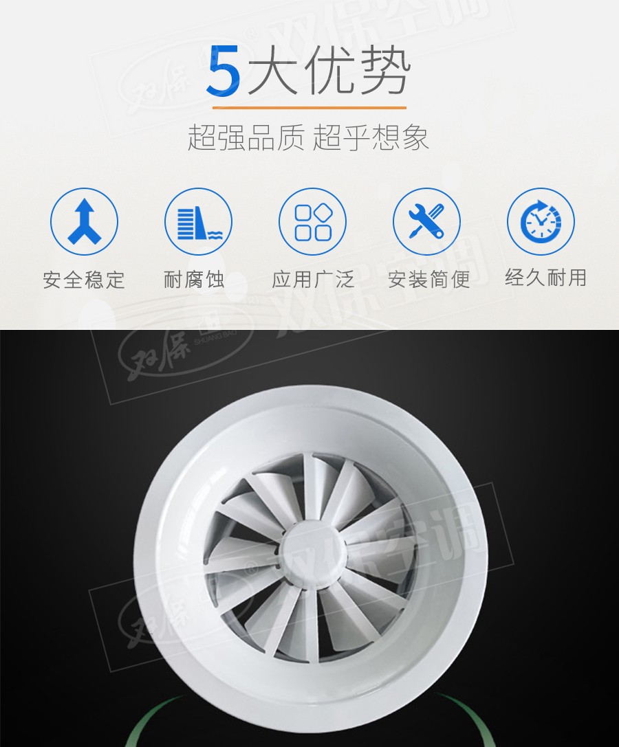 江蘇雙保空調有限公司—旋流風口用于高大空間送風,射程遠。常用于頂送風,可電動或手動調節送風風量。面板為冷軋鍍鋅鋼板,散流圈為深拉沖壓鋁制件,表面為純白色(RAL9010)漆。