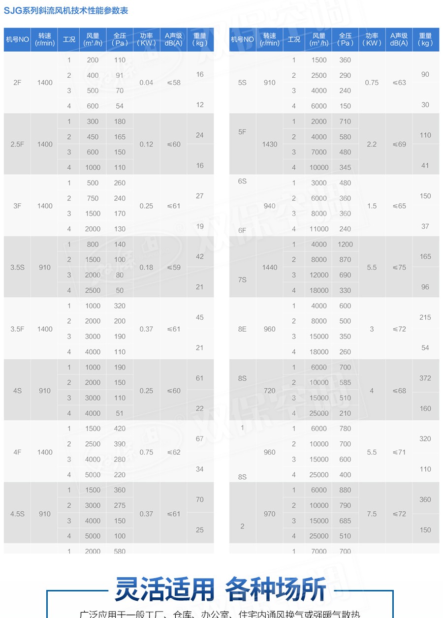 【風(fēng)機(jī)特點(diǎn)】同型號(hào)斜流風(fēng)機(jī)的風(fēng)壓較混流風(fēng)機(jī)高,該風(fēng)機(jī)最適用于直管道加壓送風(fēng)和排風(fēng)。占地少、安裝方便(水平、垂直、吊裝均可)。